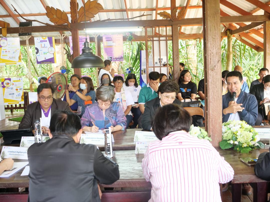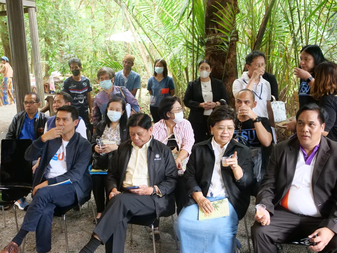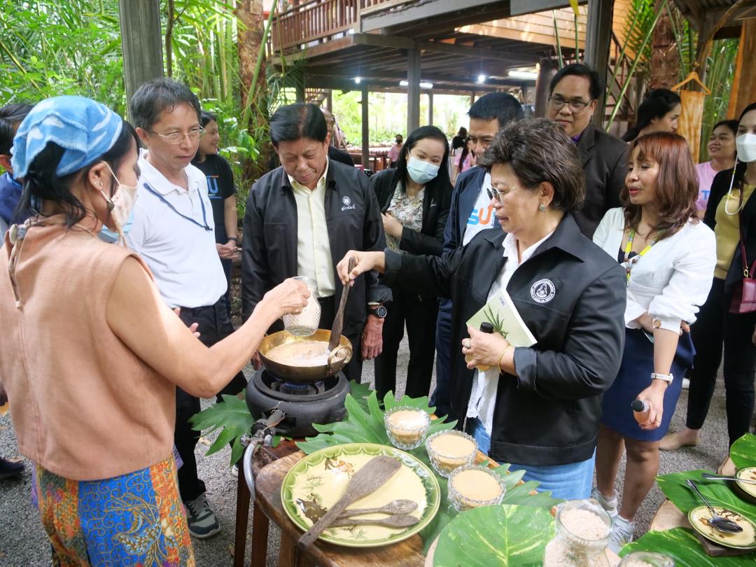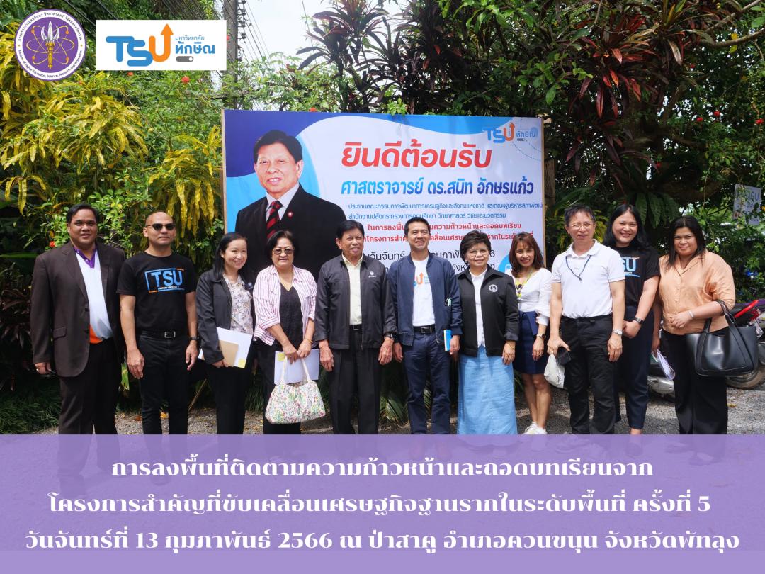 เมื่อวันที่ 13 กุมภาพันธ์ 2566 รองศาสตราจารย์ ดร.ณฐพงศ์ จิตรนิรัตน์ อธิการบดีมหาวิทยาลัยทักษิณ และผู้บริหาร ร่วมต้อนรับศาสตราจารย์ ดร.สนิท อักษรแก้ว ประธานอนุกรรมการติดตามโครงการภายใต้แผนงานสร้างความเข้มแข็งแก่เศรษฐกิจฐานราก พร้อมคณะผู้บริหารจากสภาพัฒน์ ท่านสุวรรณี คำมั่น/ ท่านนิสากร จึงเจริญธรรม ที่ปรึกษารัฐมนตรี และผู้บริหารจากกระทรวง อว. เครือข่ายชุมชนตำบลควนขนุน/ นวัตกรชุมชน ในการลงพื้นที่ติดตามความก้าวหน้าและถอดบทเรียนจากโครงการสำคัญที่ขับเคลื่อนเศรษฐกิจฐานรากในระดับพื้นที่ ครั้งที่ 5 ในโครงการยกระดับเศรษฐกิจและสังคมรายตำบลแบบบูรณาการ และโครงการขับเคลื่อนเศรษฐกิจและสังคมฐานรากหลังโควิดด้วยเศรษฐกิจ BCG ภายใต้การดำเนินงานของมหาวิทยาลัยทักษิณ วิทยาเขตพัทลุง ณ พื้นที่ตำบลควนขนุน อำเภอควนขนุน จังหวัดพัทลุง
