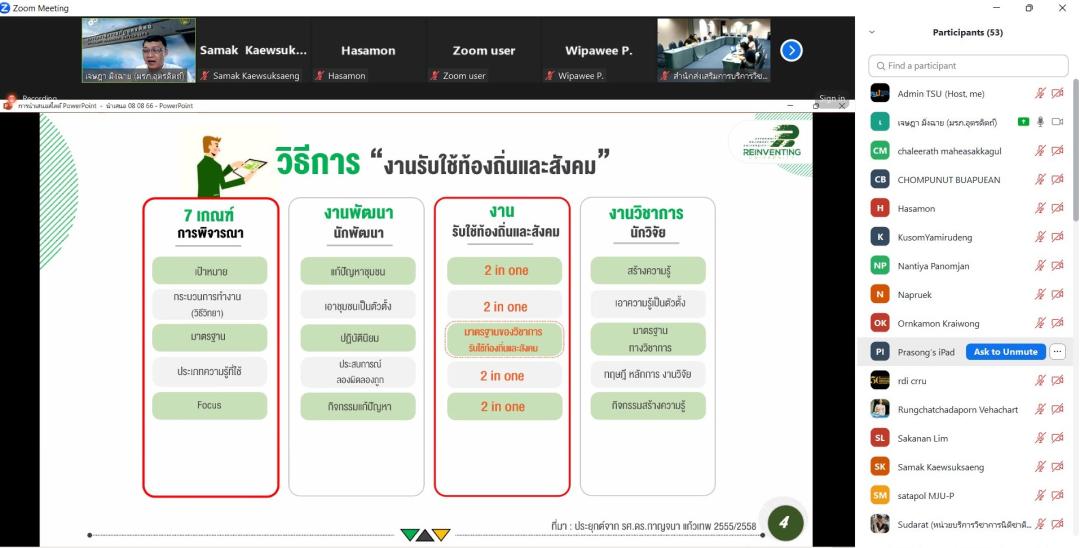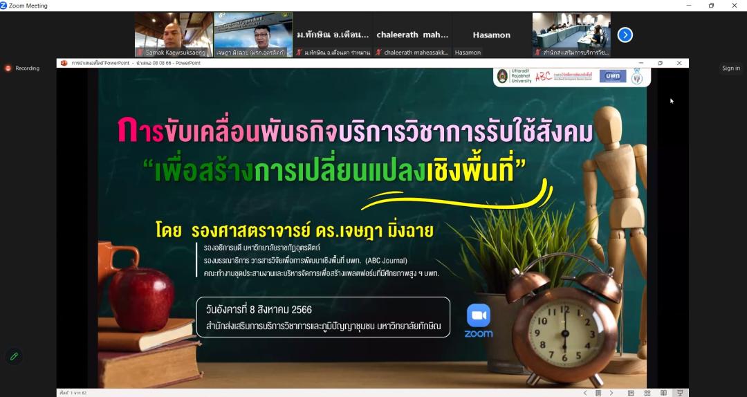 8 สิงหาคม 2566 รองศาสตราจารย์ ดร.สมัคร แก้วสุกแสง รองอธิการบดีฝ่ายวิจัยและนวัตกรรม กล่าวเปิดการประชุมพัฒนาศักยภาพบุคคลากรด้านการบริการวิชาการ ซึ่งได้รับเกียรติจาก รองศาสตราจารย์ ดร.เจษฎา มิ่งฉาย รองอธิการบดีมหาวิทยาลัยราชภัฏอุตรดิตถ์ บรรยายพิเศษ หัวข้อ “การขับเคลื่อนพันธกิจบริการวิชาการรับใช้สังคมเพื่อสร้างการเปลี่ยนแปลงเชิงพื้นที่” ให้กับอาจารย์ นักวิชาการ และผู้สนใจทั้งภายในและภายนอกมหาวิทยาลัยได้เข้าร่วมรับฟัง เพื่อนำเสนอมุมมองหลักคิดของงาน "รับใช้ท้องถิ่นและสังคม" และการเชื่อมโยงงานบริการวิชาการกับความก้าวหน้าทางวิชาการของคณาจารย์ด้าน "รับใช้ท้องถิ่นและสังคม"  ซึ่งมีผู้เข้าร่วมผ่านระบบออนไลน์ Zoom Meeting จำนวน 70 คน จากสถาบันอุดมศึกษา 10 มหาวิทยาลัย