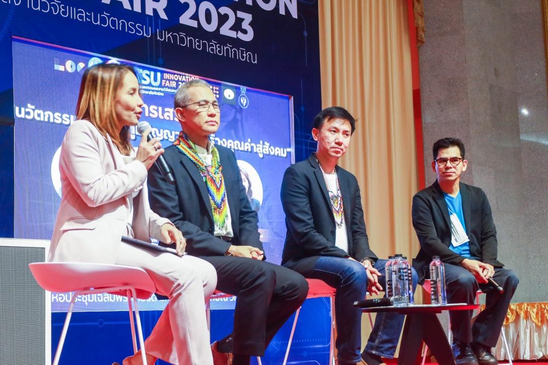 ภายในงานมหกรรมผลงานวิจัยและนวัตกรรมมหาวิทยาลัยทักษิณ TSU Innovation Fair 2023 : 55 นวัตกรรมเด่นสู่การขับเคลื่อนสังคม โดยมีวัตถุประสงค์เพื่อสร้างเครือข่ายความร่วมมือทางด้านการบริการวิชาการระหว่างหน่วยงานภาครัฐ ภาคเอกชน และภาคประชาสังคม สนับสนุนการขับเคลื่อนงานบริการวิชาการตามพันธกิจของมหาวิทยาลัย และเพื่อเป็นการสร้างแรงบันดาลใจและแลกเปลี่ยนเรียนรู้การทำงานบริการวิชาการขับเคลื่อนสังคมให้แก่อาจารย์ นักวิชาการ และนิสิต ณ หอประชุมเฉลิมพระเกียรติ มหาวิทยาลัยทักษิณ วิทยาเขตพัทลุง ตำบลบ้านพร้าว อำเภอป่าพะยอม จังหวัดพัทลุง
