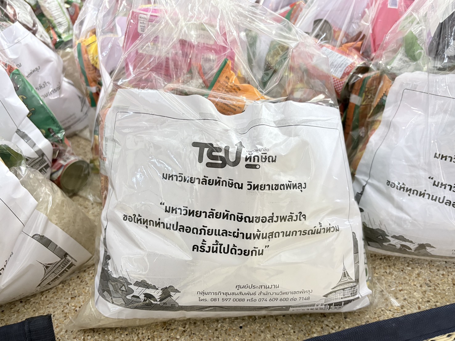 สสช. มหาวิทยาลัยทักษิณ ร่วมส่งมอบน้ำดื่มและถุงยังชีพ ผ่านศูนย์ปันน้ำใจ ม.ทักษิณ ช่วยเหลือผู้ประสบภัยน้ำท่วม จ.พัทลุง