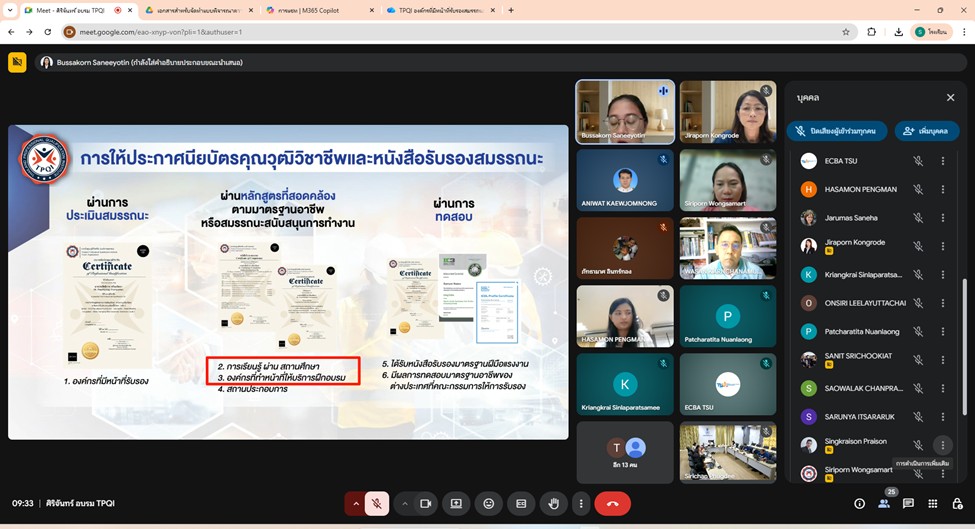 เมื่อวันอังคารที่ 21 เมษายน 2569 สถาบันส่งเสริมการบริการวิชาการ (สสช.) มหาวิทยาลัยทักษิณ ดำเนินการจัดการประชุมผ่านระบบออนไลน์ร่วมกับสถาบันคุณวุฒิวิชาชีพ (องค์การมหาชน) เพื่อเตรียมความพร้อมในการยื่นคำขอพิจารณาหลักสูตรการเรียนรู้ให้มีความสอดคล้องกับมาตรฐานอาชีพ โดยมุ่งเป้าพัฒนาศักยภาพผู้เรียนให้มีสมรรถนะตรงตามความต้องการของภาคอุตสาหกรรมและตลาดแรงงานในปัจจุบัน