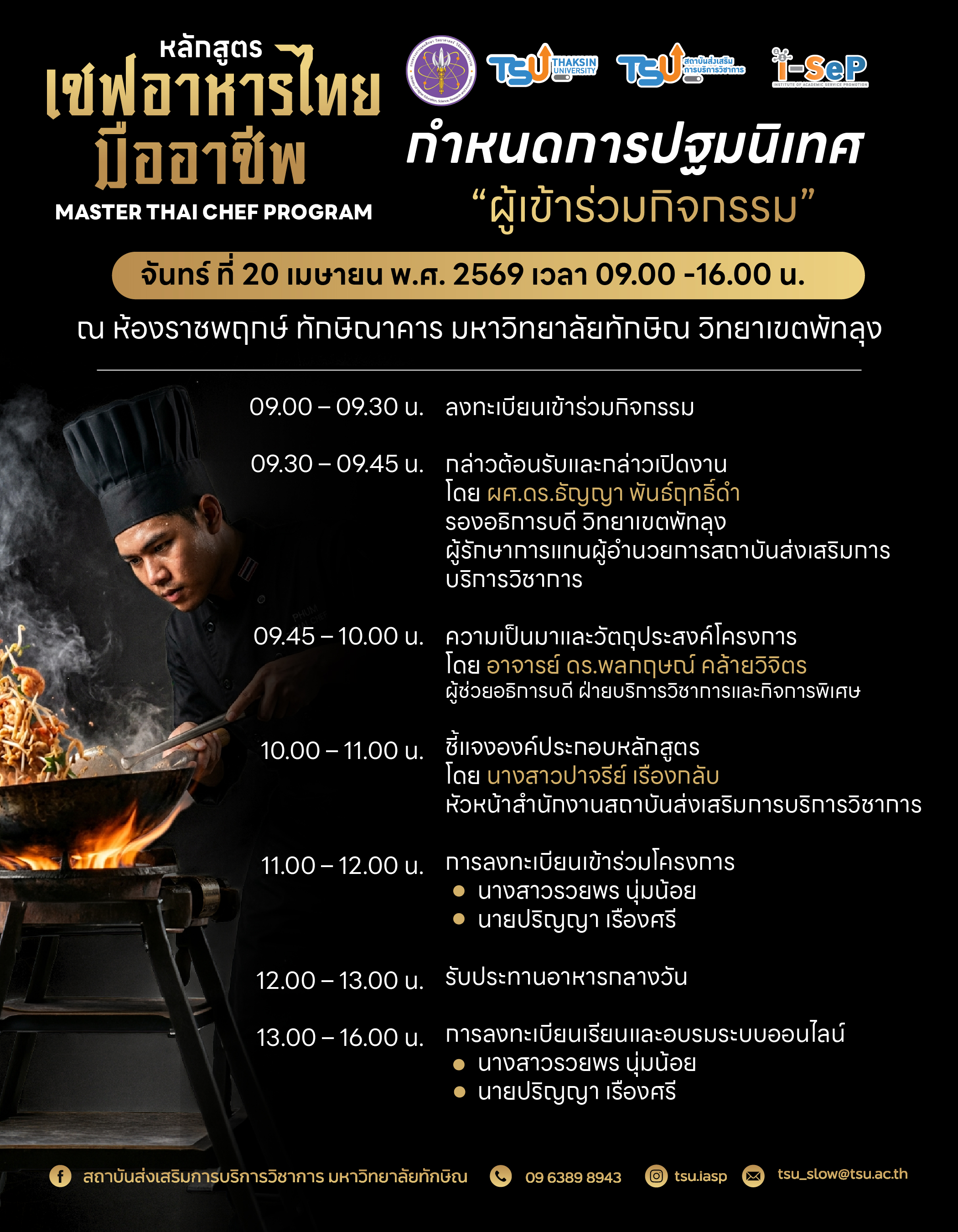 สถาบันส่งเสริมการบริการวิชาการ (สสช.) มหาวิทยาลัยทักษิณ กำหนดจัดกิจกรรมปฐมนิเทศผู้เข้าร่วมการฝึกอบรมหลักสูตร "เชฟอาหารไทยมืออาชีพ" (Master Thai Chef Program)