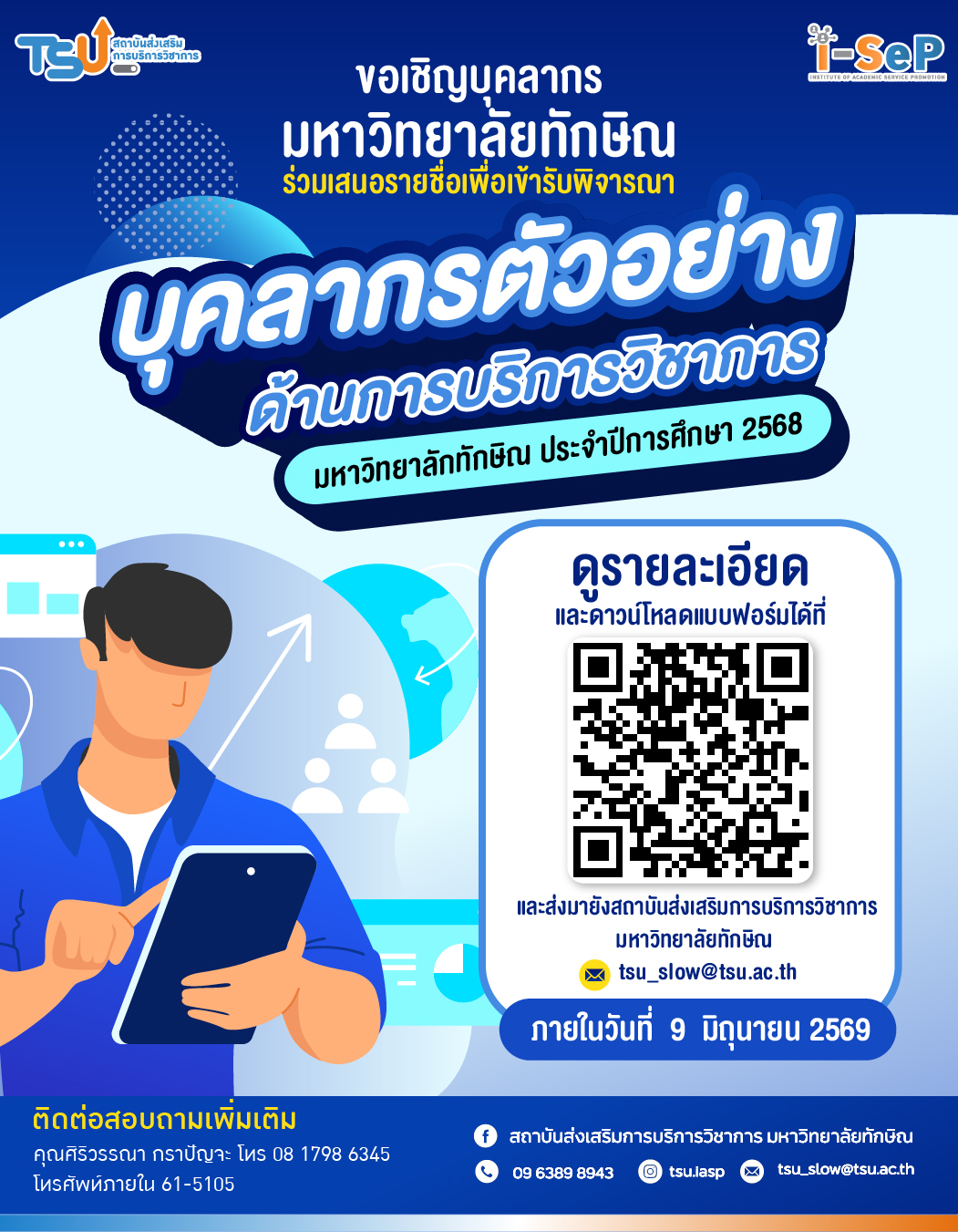 สสช. มหาวิทยาลัยทักษิณ เปิดรับเสนอชื่อ "บุคลากรตัวอย่างด้านการบริการวิชาการ" ปี 2568 ร่วมเชิดชูเกียรติและสร้างขวัญกำลังใจแก่ผู้ขับเคลื่อนงานบริการวิชาการรับใช้สังคม